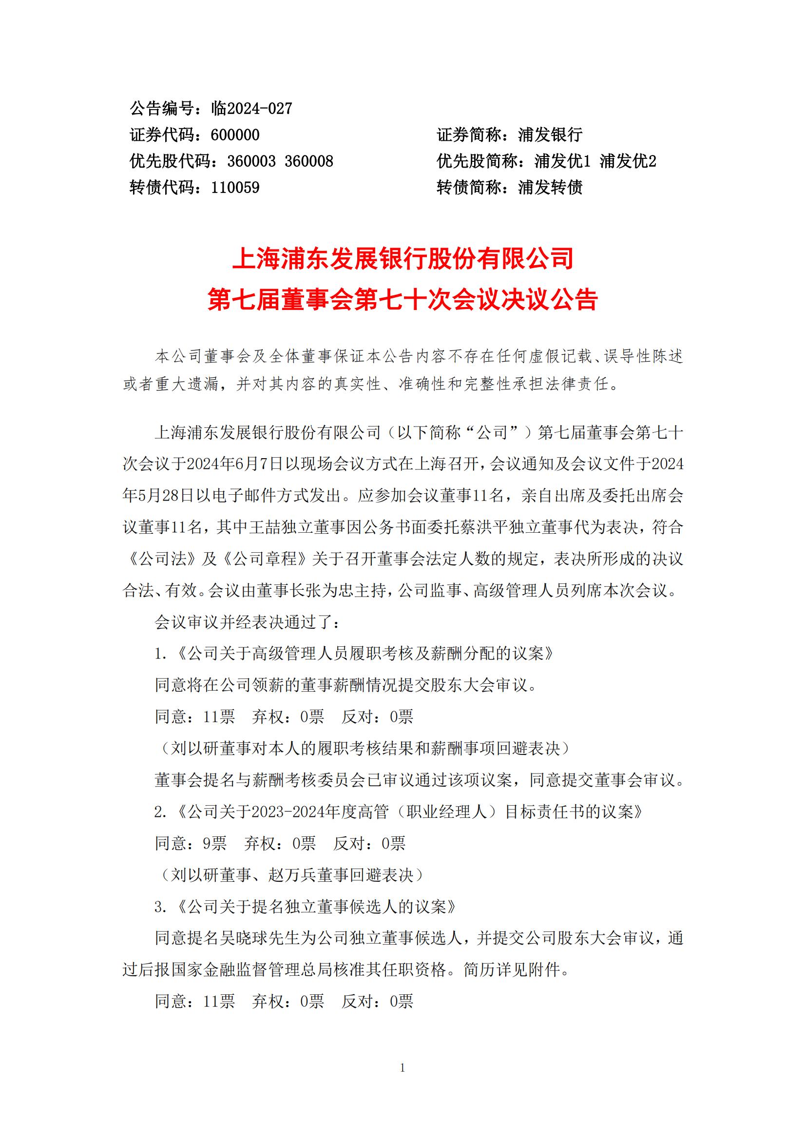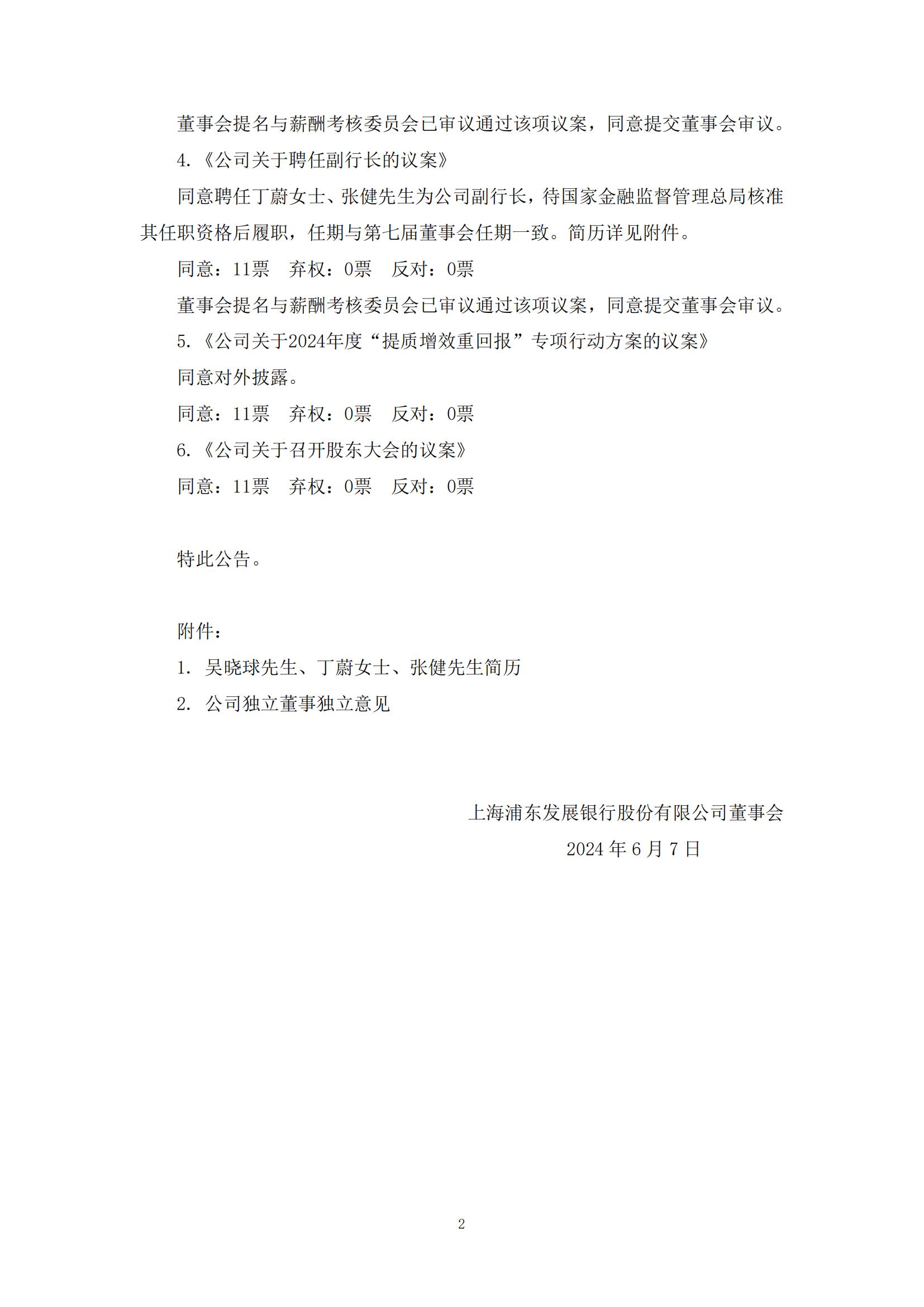 6月7日金融一线消息,浦发银行今日发布第七届董事会第七十次会议决议公告,审议通过《公司关于聘任副行长的议案》,同意聘任丁蔚、张健为公司副行长。